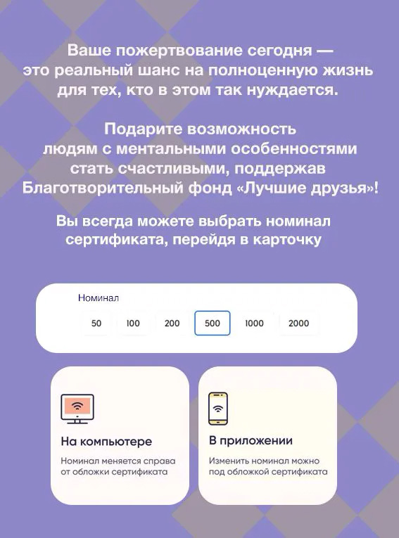 Это простой способ стать частью важных перемен. Средства, перечисленные через сертификат, пойдут на помощь людям с синдромом Дауна, аутизмом и другими особенностями развития. Фонд уже много лет помогает им раскрывать таланты, находить друзей и становиться полноправными членами общества.