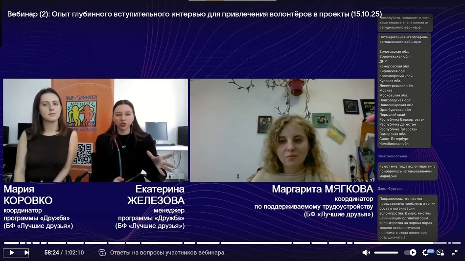 «На вебинаре мы рассказали о наших кейсах интервью с волонтёрами, о том, как сложить частные случаи в общую систему. Мы постарались подробно рассказать о ходе вступительного интервью, подсветили наши лайфхаки, обсудили – на что обращать внимание во время общения с волонтёрами. Мы хотели вдохновить наших слушателей, и, судя по отзывам во время вебинара, у нас это немного получилось».
