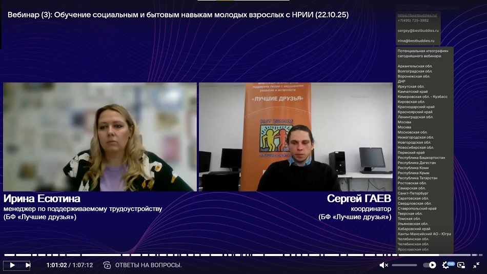 В конце вебинара Ирина и Сергей ответили на вопросы участников и анонсировали следующий, заключительный вебинар цикла, который посвящён трудоустройству людей с ментальными особенностями на открытом рынке труда.